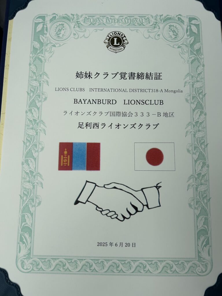 2025-2026 足利西LC活動報告 2026年4月17日 最終更新日時 : 2026年4月25日 lc333b モンゴルBAYANBURD LCと姉妹クラブ提携、結成60周年記念事業、モンゴルの子供たちとの交流、足利花火後清掃活動。